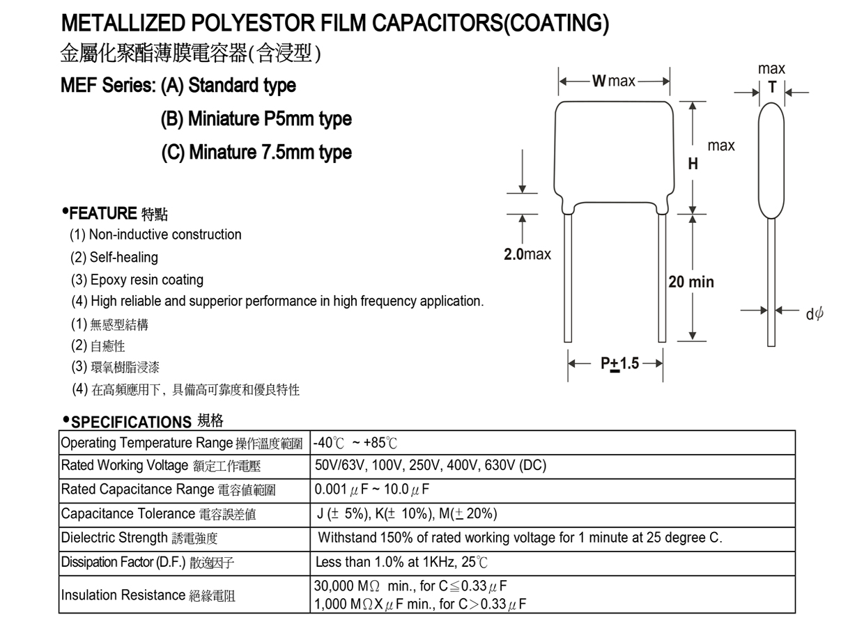 金屬化聚酯薄膜電容器(含浸型) MEF系列